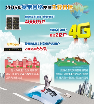 工信部提出,2015年的主要目標(biāo)是,新增光纖到戶寬帶用戶4000萬戶,新增4G用戶超過2億戶,使用8Mbps及以上接入速率的寬帶用戶占比達(dá)到55%。