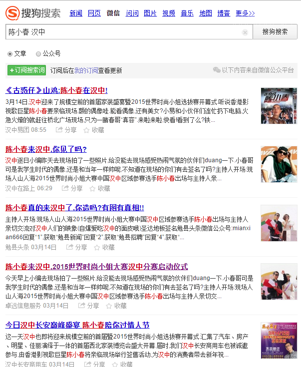 經(jīng)過(guò)“陜西新媒體”的平臺(tái)監(jiān)控,我們發(fā)現(xiàn)3月14日有個(gè)地區(qū)性新聞在微信公眾號(hào)和微信朋友圈里面?zhèn)鞑V泛。內(nèi)容就是“陳小春來(lái)漢中,你見了嗎?”,下面是漢中各公號(hào)的內(nèi)容列表:
