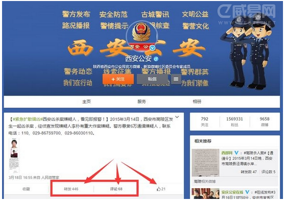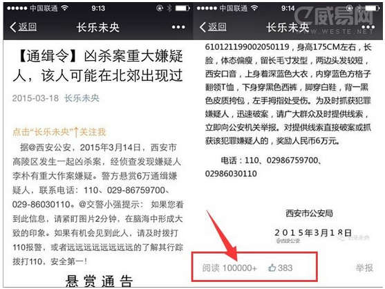 在這起“通緝令”傳播事件中,未央?yún)^(qū)網(wǎng)信辦負(fù)責(zé)人介紹說(shuō)是出于對(duì)市民的提醒,維護(hù)社會(huì)和諧。在朋友圈瘋狂轉(zhuǎn)發(fā)的市民出于對(duì)自身安全權(quán)益的保護(hù),自覺(jué)轉(zhuǎn)發(fā)。此時(shí)公眾利益與政府訴求是高度一致的?!巴ň兞睢蔽恼略诠俜秸J(rèn)證公號(hào)已經(jīng)發(fā)出,似乎坐上了火箭,半日內(nèi)閱讀量極速超過(guò)10萬(wàn)。