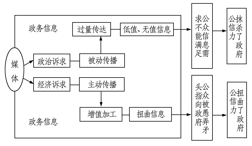 其次,媒體對(duì)政務(wù)信息的主動(dòng)性選擇傳播,表現(xiàn)出強(qiáng)烈的經(jīng)濟(jì)性?xún)A向。 媒體作為擁有獨(dú)立利益的經(jīng)濟(jì)實(shí)體,對(duì)信息進(jìn)行加工、整理、傳播才能維持自身運(yùn)轉(zhuǎn)。媒體為了追求經(jīng)濟(jì)利益的最大化,需要針對(duì)公眾的“信息饑渴”,選擇那些比較敏感的、重大的政務(wù)信息傳播。然而,由于政府對(duì)政務(wù)信息的嚴(yán)密控制,媒體通過(guò)各種渠道挖掘出來(lái)的信息總是不完整的。出于市場(chǎng)需要,媒體不得不對(duì)所挖掘到的信息進(jìn)行“增殖”加工。這一加工過(guò)程又受到媒體自身價(jià)值觀念、利益團(tuán)體操縱等多種因素的影響,導(dǎo)致夸大或扭曲政務(wù)信息價(jià)值。因而即使是同一信息,各大媒體總會(huì)加上了自己或個(gè)別利益團(tuán)體的主觀偏好。公眾在接受到經(jīng)過(guò)媒體加工政務(wù)信息后,一般不會(huì)有辨別真?zhèn)蔚囊庾R(shí)和行為,一旦獲知信息不符合實(shí)際,就會(huì)有一種被欺騙愚弄的感覺(jué),然而被愚弄的矛頭卻不是指向媒體而是直指政府,政府公信力在媒體傳播環(huán)節(jié)中隨之被扭曲了。(如圖2)