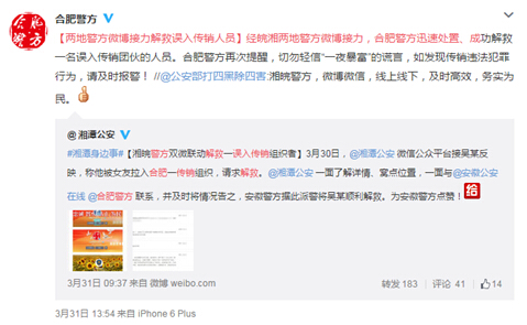 湘潭市公安局官方微博@湘潭公安介紹,3月30日,該局微博運(yùn)營(yíng)人員在微信公眾平臺(tái)接到報(bào)警,湘潭人吳某某被困于安徽合肥一傳銷窩點(diǎn)。運(yùn)營(yíng)人員立刻與@安徽公安在線運(yùn)營(yíng)負(fù)責(zé)人聯(lián)系,并向合肥市公安局官方微博@合肥警方發(fā)私信通報(bào)被困人員姓名、地址和聯(lián)系方式等信息,請(qǐng)求配合。不到5分鐘@合肥警方就通過(guò)私信回應(yīng),詢問(wèn)被困人員的詳細(xì)信息。
