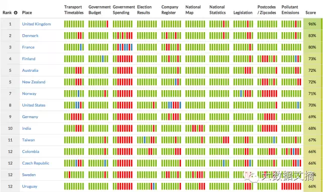 開放數(shù)據(jù)指數(shù)通過評(píng)估各國10個(gè)關(guān)鍵數(shù)據(jù)集,例如政府項(xiàng)目級(jí)支出數(shù)據(jù)、國家公共交通時(shí)刻表、環(huán)境污染指數(shù)等的可獲取性和可訪問性來進(jìn)行國家級(jí)開放數(shù)據(jù)項(xiàng)目績效排序。 2014年,英國再摘開放數(shù)據(jù)指數(shù)的桂冠,總體開放性達(dá)到了96%,而緊隨其后的則是丹麥以及去年排名才12位而今年已到第3位的法國。第4位的是芬蘭,而第5位則由澳大利亞和新西蘭共享。今年的指數(shù)結(jié)果里最令人振奮的有去年排名27而今年進(jìn)步到第10位的印度,以及共同占據(jù)第12位的拉丁美洲的哥倫比亞和烏拉圭。 塞拉利昂,馬里共和國,海地以及幾內(nèi)亞在今年的開放數(shù)據(jù)指數(shù)中墊底,但需要指出的,還有更多比這些政府在數(shù)據(jù)開放性上更糟糕的,這里沒有包含他們主要是因?yàn)闆]有足夠的公開數(shù)據(jù)以供評(píng)估以及當(dāng)?shù)貨]有足夠的志愿者來完成相應(yīng)的評(píng)估。 整體而言,雖然開放的關(guān)鍵數(shù)據(jù)集整體數(shù)量有所上升(從87到104),但開放數(shù)據(jù)集占整體的比例仍舊很低,僅為11%。 即使對(duì)于那些在開放數(shù)據(jù)項(xiàng)目上的領(lǐng)頭國家,也有大量的提升空間:比如對(duì)于美國和德國,他們就沒有提供整合的、開放的企業(yè)注冊(cè)數(shù)據(jù)庫。而政府項(xiàng)目級(jí)支出的數(shù)據(jù)開放性也讓人大失所望,大多數(shù)國家要么完全沒有提供此類信息,又或者僅提供了有限的信息。在97個(gè)國家中,僅有英國和希臘兩個(gè)國家提供了完全開放的政府項(xiàng)目級(jí)支出數(shù)據(jù)。在目前各國經(jīng)濟(jì)增長仍舊緩慢甚至艱巨的時(shí)期,提供市民和企業(yè)免費(fèi)開放的數(shù)據(jù)意味著我們能夠更高效的開源節(jié)流,以及提高政府效能。 Pollock 說道: