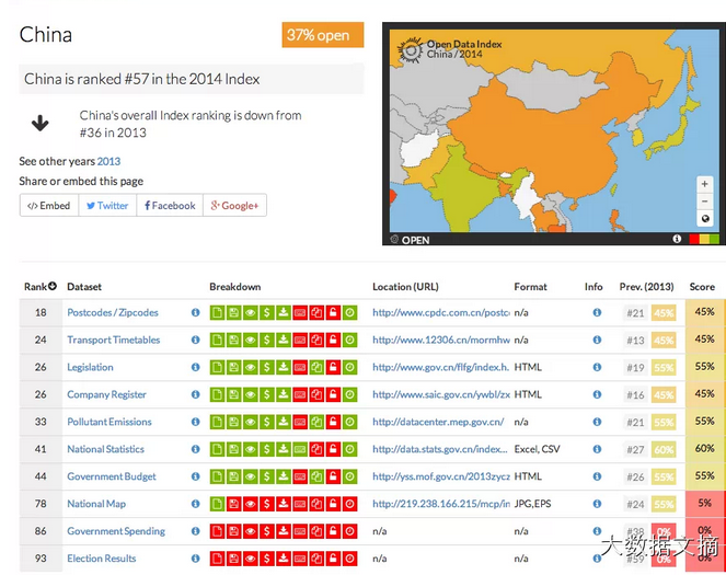 對(duì)于中國而言,中央政府至今還未推出相應(yīng)的開放數(shù)據(jù)政策,而與開放數(shù)據(jù)相關(guān)聯(lián)的數(shù)據(jù)所有權(quán)界定、數(shù)據(jù)授權(quán)、個(gè)人隱私保護(hù)法等議題也都尚在討論中。較之2013年,中國在10個(gè)關(guān)鍵數(shù)據(jù)集的開放上并未有進(jìn)步,也因此當(dāng)大量新國家加入開放數(shù)據(jù)指數(shù),以及若干國家有了大幅進(jìn)步以后,中國的排名從2013年的36名下滑至了57名。