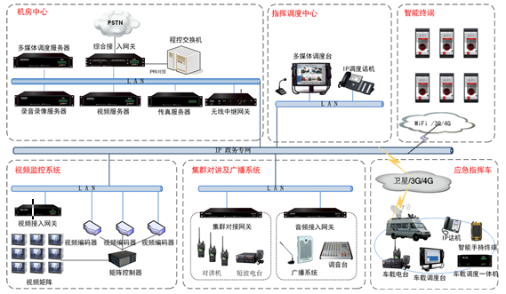 政府智慧應(yīng)急平臺(tái)依托電子政務(wù)外網(wǎng),建設(shè)一套應(yīng)急通信調(diào)度系統(tǒng),建設(shè)內(nèi)容主要包括綜合指揮調(diào)度通信系統(tǒng)、多路傳真系統(tǒng)、數(shù)字錄音錄像系統(tǒng)、視頻調(diào)度系統(tǒng)、業(yè)務(wù)接口開發(fā)、與其他系統(tǒng)的互聯(lián),及調(diào)度臺(tái)終端設(shè)備等。通過建設(shè)的應(yīng)急指揮調(diào)度平臺(tái),利用多媒體調(diào)度系統(tǒng)軟交換技術(shù)實(shí)現(xiàn)應(yīng)急指揮中心與各有線系統(tǒng)、無線系統(tǒng)、視頻調(diào)度系統(tǒng)之間的語音、視頻、數(shù)據(jù)服務(wù),集中對(duì)整個(gè)系統(tǒng)提供全面的支持。通過在應(yīng)急指揮車上部署車載一體化調(diào)度設(shè)備,車載指揮調(diào)度平臺(tái)能在緊急情況下可快速抵達(dá)事發(fā)地點(diǎn),利用公共網(wǎng)絡(luò)能快速有效的指揮、救援、調(diào)度,保證快速、及時(shí)、準(zhǔn)確收集現(xiàn)場信息,為指揮任務(wù)提供實(shí)時(shí)的決策信息。