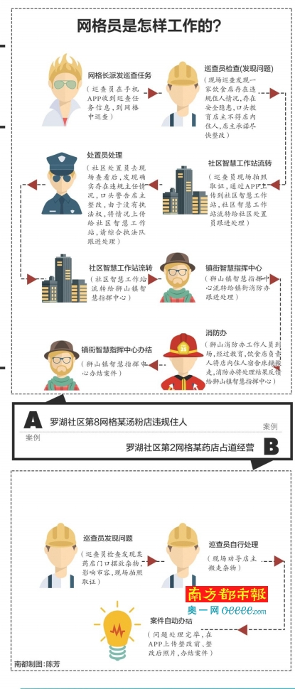 “以前檢查一個工廠,今天安監(jiān)去,明天消防去,后天城管去,對企業(yè)干擾多次,現(xiàn)在一個巡查員去一次就搞掂了。”羅湖社區(qū)黨委副書記、社區(qū)服務(wù)中心主任吳其國介紹,實施網(wǎng)格化之后,該社區(qū)40多名工作人員進行重新整合,成為網(wǎng)格里的巡查員、處置員、坐席員,并無增員。