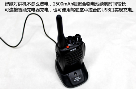 智能對講機不怎么費電,2500mAh鋰聚合物電池續(xù)航時間較長,充電快,可連接智能充電器充電,也可以用USB線直接連接對講機,使用駕駛室中控臺的USB口實現(xiàn)充電。