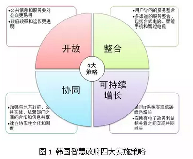 智慧政府建設強調(diào)在政府信息化的基礎上突出智能化及服務化,主張利用先進信息技術,提高政府辦公、監(jiān)管、服務、決策的智能化水平,更好地為公民提供方便、個性化的服務。2011 年3 月,韓國公共行政與安全部制定了《智慧政府實施計劃》,目標是在2015 年建成智慧政府,其實施策略包括四個方面:開放、整合、協(xié)同、可持續(xù)的綠色增長(如圖1)。2011年11月,美國加利福尼亞州為提高政府服務的績效及服務度,提出了《智慧政府建設框架》,框架為社區(qū)、地區(qū)和國家解決棘手問題、保持可持續(xù)發(fā)展和繁榮提供了一系列治理原則。2014年6月,新加坡政府公布了“智慧國家2025”的10年計劃,提出將構(gòu)建“智慧國平臺”,建設覆蓋全島數(shù)據(jù)收集、連接和分析的基礎設施與操作系統(tǒng),根據(jù)所獲數(shù)據(jù)預測公民需求,提供更好的公共服務。
