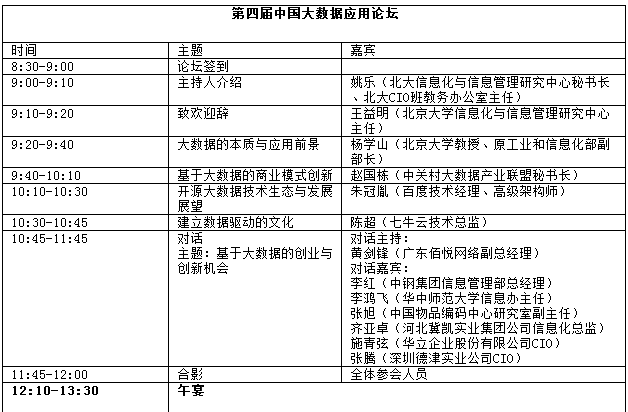以“開源大數(shù)據(jù)技術(shù)的生態(tài)與應(yīng)用”為主題的第四屆中國大數(shù)據(jù)應(yīng)用論壇將于2015年7月19日在北京大學(xué)隆重舉辦。本次論壇由北京大學(xué)信息化與信息管理研究中心和中國新一代IT產(chǎn)業(yè)推進(jìn)聯(lián)盟主辦,北京大學(xué)CIO班教務(wù)辦公室和北達(dá)軟協(xié)辦,CIO時(shí)代網(wǎng)承辦。本次論壇將探討主要開源大數(shù)據(jù)技術(shù)的發(fā)展趨勢(shì)與應(yīng)用前景,并圍繞企業(yè)、政府、金融、醫(yī)療衛(wèi)生等行業(yè)應(yīng)用場景展開討論。本次論壇主要討論的議題將包括大數(shù)據(jù)的開源生態(tài)系統(tǒng)、大數(shù)據(jù)的技術(shù)架構(gòu)、基于大數(shù)據(jù)的創(chuàng)業(yè)與創(chuàng)新、基于大數(shù)據(jù)的行業(yè)應(yīng)用等。