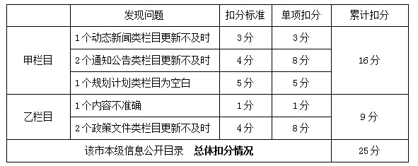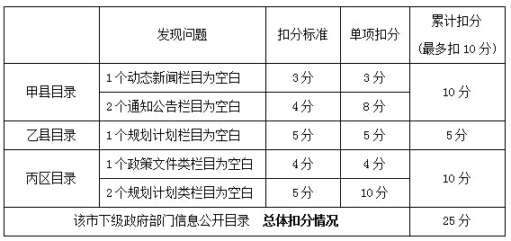 例如:某市政府門戶網(wǎng)站上各區(qū)縣信息公開(kāi)目錄中,有3個(gè)目錄存在問(wèn)題,具體問(wèn)題類型、數(shù)量和扣分計(jì)算過(guò)程如下。該市下級(jí)政府信息公開(kāi)目錄總體扣25分。