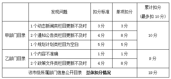 例如:某市政府門戶網(wǎng)站市級(jí)所屬部門信息公開(kāi)目錄中,有2個(gè)部門目錄存在問(wèn)題,具體問(wèn)題類型、數(shù)量和扣分計(jì)算過(guò)程如下。該市所屬部門信息公開(kāi)目錄總體扣19分。