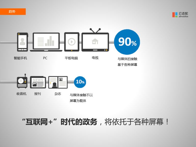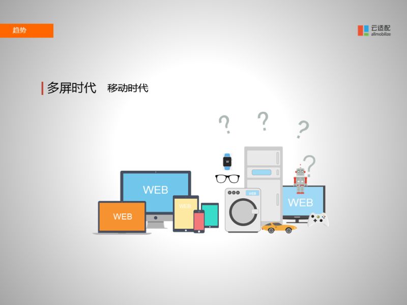 大家現(xiàn)在都叫移動(dòng)互聯(lián)網(wǎng),但是在云適配的眼里,"移動(dòng)互聯(lián)網(wǎng)"的叫法已經(jīng)過時(shí)了,未來我們將會(huì)進(jìn)入一個(gè)新的時(shí)代,叫"多屏互聯(lián)網(wǎng)"時(shí)代,因?yàn)槲磥砘ヂ?lián)網(wǎng)會(huì)接入的設(shè)備不僅僅是手機(jī),還會(huì)有汽車、手表、眼鏡等等。我們今天已經(jīng)看到有各種各樣的智能設(shè)備接入互聯(lián)網(wǎng),而且人們也正在使用各種各樣的設(shè)備從互聯(lián)網(wǎng)上接收信息。所以政府在做移動(dòng)化、信息化的過程中,不僅僅是考慮電腦、手機(jī),更重要的是考慮更長遠(yuǎn)的:各種各樣的屏幕, 未來可能就是在汽車上、手表上、眼鏡上接收政府宣傳的信息。