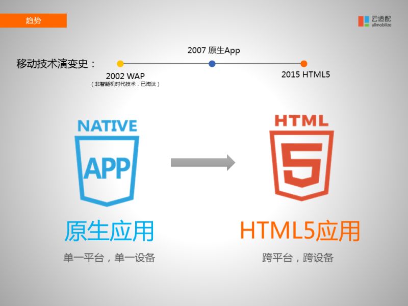 大家可以看到這個(gè)圖上有一個(gè)移動(dòng)技術(shù)的演變史,大家可能都知道在2000年初的時(shí)候有一個(gè)WAP技術(shù),功能機(jī)的時(shí)代就能上網(wǎng),那是一個(gè)非常簡化版本的移動(dòng)互聯(lián)網(wǎng)標(biāo)準(zhǔn),只能看看非常簡單的圖片和文字。到了2007年,IPHONE等智能手機(jī)發(fā)布,蘋果提出了"APP"概念,使得移動(dòng)互聯(lián)網(wǎng)相比WAP的用戶體驗(yàn)有了顯著的提升。APP也叫原生應(yīng)用,它只是為了一個(gè)單一的平臺(tái)設(shè)計(jì)的,當(dāng)時(shí)蘋果提出APP的時(shí)候只是為了自己的IOS系統(tǒng),它開發(fā)的所有APP也只能在IOS系統(tǒng)上應(yīng)用。后來GOOGLE也提出了自己安卓系統(tǒng)的APP標(biāo)準(zhǔn)、微軟也提出了自己WINDOWS手機(jī)上的 APP標(biāo)準(zhǔn)。總之,每個(gè)操作系統(tǒng)的廠商都提出了自己APP的標(biāo)準(zhǔn),這就導(dǎo)致了不同平臺(tái)開發(fā)不同的APP這樣的格局。而且當(dāng)時(shí)APP的提出只是為了手機(jī)設(shè)計(jì)的,如果你還要開發(fā)IPAD的話,要重新開發(fā)。所以簡單來說,APP原生應(yīng)用是為了單一平臺(tái)、單一應(yīng)用而設(shè)計(jì)的。所以后來W3C也看到這個(gè)問題的存在,計(jì)劃推出下一代的HTML5標(biāo)準(zhǔn)技術(shù),HTML5能夠讓你開發(fā)的應(yīng)用橫跨所有的平臺(tái)、橫跨所有的設(shè)備。