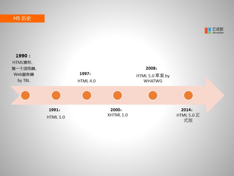 這是一個(gè)HTML發(fā)展的整個(gè)歷史。大家也可以看到世界上第一個(gè)互聯(lián)網(wǎng)雛形是1990年由歐洲一叫TBL的人提出來的。這個(gè)技術(shù)很快在科研領(lǐng)域得到了認(rèn)可。在1991年,TML把HTML技術(shù)寫成了一個(gè)正式的標(biāo)準(zhǔn)文檔,就是當(dāng)時(shí)的HTML1.0。很快,互聯(lián)網(wǎng)技術(shù)迅速從科研領(lǐng)域蔓延到民用領(lǐng)域和商業(yè)領(lǐng)域。尤其在1994年的時(shí)候,網(wǎng)景公司開發(fā)了世界上第一個(gè)商用瀏覽器,極大程度促進(jìn)了老百姓對(duì)互聯(lián)網(wǎng)的使用。隨后,微軟馬上也開發(fā)了IE瀏覽器。從1994年到1997年,網(wǎng)景瀏覽器和IE瀏覽器之間發(fā)生了激烈的瀏覽器大戰(zhàn),這也極大的促進(jìn)了HTML標(biāo)準(zhǔn)的進(jìn)步。很快,HTML進(jìn)步了幾個(gè)版本,到1997年進(jìn)步到HTML4.0 。當(dāng)然,大家都知道,最后的結(jié)局是IE瀏覽器徹底打敗了網(wǎng)景瀏覽器,搶走了所有瀏覽器的市場份額,所以在IE5.5版本發(fā)布之后,基本IE瀏覽器就是一枝獨(dú)秀了。之后HTML標(biāo)準(zhǔn)就進(jìn)入了很長一段時(shí)間的平靜期。這個(gè)時(shí)候W3C覺得當(dāng)時(shí)的HTML設(shè)計(jì)的不夠完善,所以在2000年的時(shí)候提出了XHTML,這個(gè)版本比原版HTML語法要嚴(yán)格很多,也加入了語義的元素進(jìn)去??上У氖牵^去的HTML4.0已經(jīng)根深蒂固了,很難使得整個(gè)互聯(lián)網(wǎng)向XHTML遷移。最后W3C發(fā)現(xiàn)了XHTML很難推,又恰逢蘋果發(fā)布了智能手機(jī),整個(gè)市場對(duì)新一代HTML有強(qiáng)烈的需求。在2008年HTML聯(lián)合了另一個(gè)民間組織,發(fā)布了HTML5.0的草案。