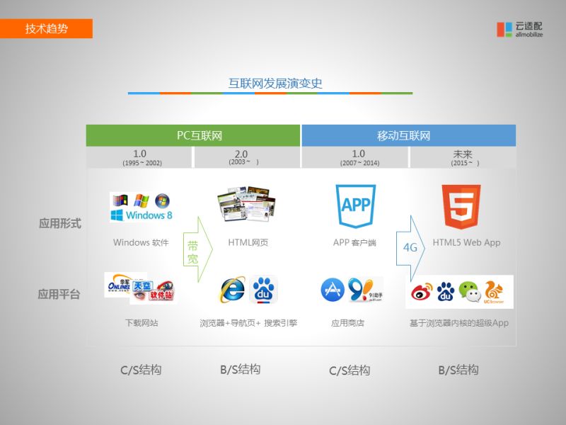 導(dǎo)致從WINDOWS軟件到HTML網(wǎng)頁的變遷的核心推動(dòng)力就是當(dāng)時(shí)的帶寬。在2000初的時(shí)候,中國開始大規(guī)模的布寬帶,早期撥號(hào)上網(wǎng)的年代網(wǎng)絡(luò)速度很慢,大家都傾向于下載軟件放在桌面上,在沒有網(wǎng)絡(luò)的時(shí)候也能使用,但是當(dāng)寬帶逐漸普及的時(shí)候,只要打開瀏覽器直接輸入網(wǎng)址就能找到想要的信息,沒有必要下載軟件了。這樣網(wǎng)頁就取代了軟件。去年中國的4G牌照下發(fā),三大運(yùn)營商都開始大規(guī)模的普及4G,這個(gè)4G就有點(diǎn)像當(dāng)年的寬帶,網(wǎng)絡(luò)帶寬大幅度提升,資費(fèi)大幅度降低?,F(xiàn)在李總理也強(qiáng)調(diào)要降低網(wǎng)絡(luò)資費(fèi)。這樣的大的歷史環(huán)境的催生下,APP客戶端的形式也會(huì)重復(fù)當(dāng)年P(guān)C互聯(lián)網(wǎng)的歷史,向HTML5網(wǎng)頁形式轉(zhuǎn)變。