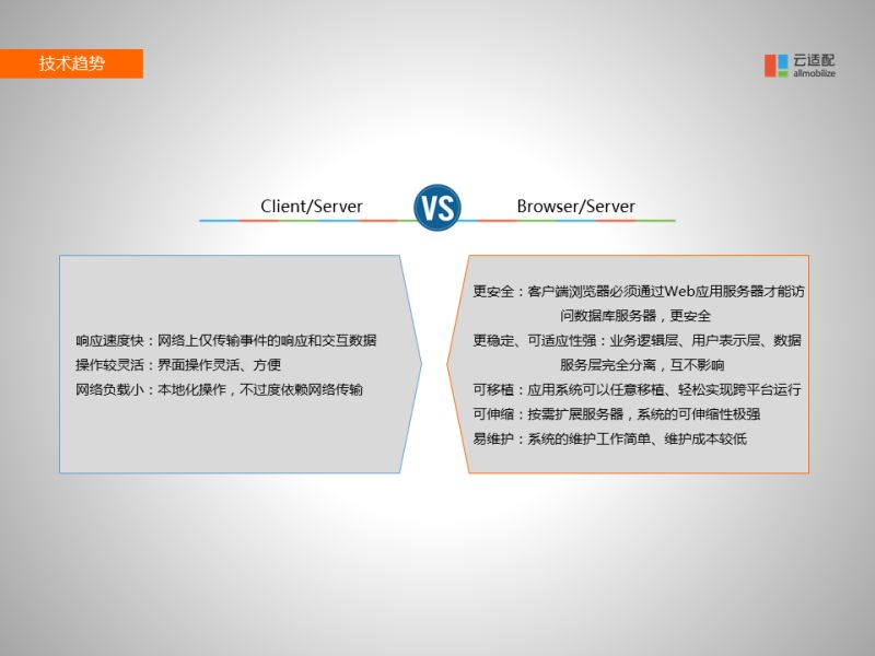 從C/S與B/S的對(duì)比圖可以看出,APP對(duì)比HTML5在響應(yīng)速度、網(wǎng)絡(luò)依賴的不同。另外我想補(bǔ)充的是,一是B/S結(jié)構(gòu)相對(duì)更加安全。因?yàn)楹诳秃苋菀自L問你本地的客戶端,很多數(shù)據(jù)處理邏輯都在客戶端里,很容易被黑客竊??;如果是B/S結(jié)構(gòu)的話,你所有的計(jì)算都在服務(wù)器端,別人是很難竊取你的商業(yè)機(jī)密的。第二,客戶端軟件很容易中病毒的。你發(fā)出去的APP可能被黑客重新打包、接入病毒再傳播出去。比如政務(wù)辦公APP,可能被黑客打包加入病毒再發(fā)布到應(yīng)用商店里去,老百姓在應(yīng)用APP的時(shí)候,所有的行為都可以監(jiān)控到,包括核心支付、個(gè)人信息等,都會(huì)被黑客竊取。因?yàn)锽/S結(jié)構(gòu)的網(wǎng)址是唯一的,黑客是不可能偽造的,比如中國政府網(wǎng)的網(wǎng)址是www.gov.cn ,老百姓知道這個(gè)網(wǎng)址一定是到達(dá)中國政府網(wǎng),這就避免了被重新打包的危險(xiǎn)。三是,B/S結(jié)構(gòu)維護(hù)起來也非常簡單。很多時(shí)候要升級(jí)服務(wù)器端的產(chǎn)品,但如果用戶不升級(jí)其APP的話,你還需要保留一份老版本的APP,才能讓其繼續(xù)使用,這個(gè)維護(hù)成本是非常高的,而B/S結(jié)構(gòu)的話,用戶訪問到的永遠(yuǎn)是最新版,不用擔(dān)心兼容性的問題。四是操作系統(tǒng)每次升級(jí),APP都要同樣升級(jí),而B/S結(jié)構(gòu)則不會(huì)有這個(gè)問題,所以維護(hù)的工作量會(huì)降低很多。