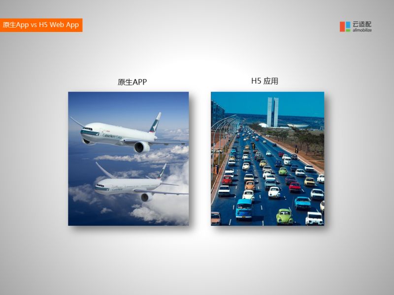 當(dāng)然,無論是原生APP還是HTML5,他們都是展現(xiàn)信息的方式,不是完全矛盾的。只是你需要根據(jù)不同的場合選擇不同的技術(shù)。這就像交通工具一樣,原生APP比較像飛機(jī),它的速度很快,但前期投入成本很高,你要修機(jī)場、跑道,而且飛機(jī)起飛降落都是很繁瑣的過程;而HTML5就像汽車,它非常靈活,非常靈巧;所以選用汽車還是飛機(jī)都要看你實(shí)際的需求。大家平時(shí)在日常生活中只要選擇汽車作為交通工具,所以絕大多數(shù)的應(yīng)用HTML5就足夠了,只有少數(shù)的應(yīng)用,像微信這種每天都要使用的、強(qiáng)交互的應(yīng)用才做APP比較合適。