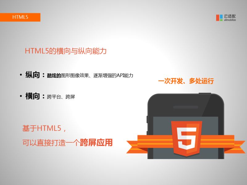 H5它的特性可以歸納成兩個(gè)方向:橫向和縱向。縱向就是有更酷炫的圖像效果,可以做出很豐富的交互界面的應(yīng)用,有很多的增強(qiáng)API可以讓你訪問攝像頭、GPS。橫向就是跨平臺(tái)、跨屏,一次開發(fā)可以運(yùn)行到很多地方,各種這樣的設(shè)備上。云適配就是致力于幫您打造HTML5跨屏應(yīng)用,對(duì)外讓老百姓無論使用什么設(shè)備、什么平臺(tái),始終可以通過同一個(gè)網(wǎng)址訪問到您的網(wǎng)站,來完成政務(wù)辦公系統(tǒng)。對(duì)內(nèi)移動(dòng)辦公協(xié)同系統(tǒng)上,每個(gè)人的手機(jī)、平臺(tái)都不一樣,用HTML5也是非常高效的。