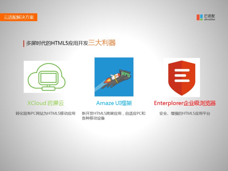 針對(duì)HTML5跨屏應(yīng)用的需求,云適配提供了三大產(chǎn)品線。一是XCLOUD跨屏云,能夠幫把現(xiàn)有的PC網(wǎng)站直接轉(zhuǎn)化成HTML5的移動(dòng)應(yīng)用,直接實(shí)現(xiàn)跨屏。二是 AMAZE UI框架,這個(gè)框架開發(fā)出的HTML5應(yīng)用自動(dòng)適應(yīng)PC和各種移動(dòng)設(shè)備。第三個(gè)是瀏覽器,是用來運(yùn)行HTML5應(yīng)用,它為HTML5提供一個(gè)增強(qiáng)的、安全的運(yùn)行平臺(tái),主要適用于移動(dòng)辦公的環(huán)境。