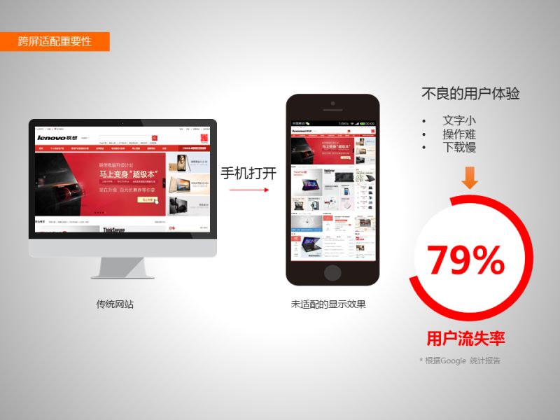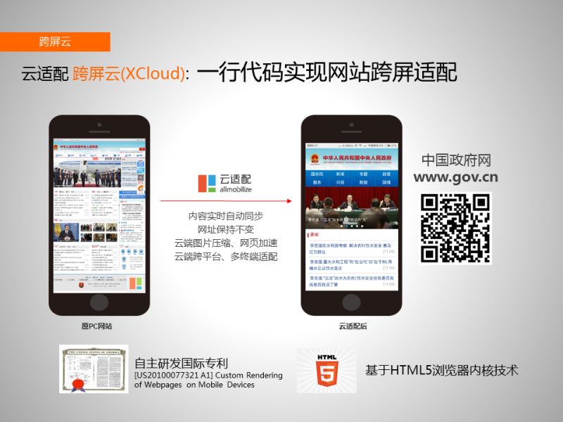 現(xiàn)在的網(wǎng)站一般是由PC開發(fā)的,在手機(jī)上打開文字和圖片很小,要用雙手去縮放,這個(gè)用戶體驗(yàn)是非常差的,會(huì)導(dǎo)致79%的用戶直接離開??缙猎苹谧灾餮邪l(fā)的國際專利技術(shù),只要在網(wǎng)站上加一串代碼,就可以把您的PC網(wǎng)站直接轉(zhuǎn)化成HTML5的移動(dòng)應(yīng)用,并且網(wǎng)址不改變、內(nèi)容實(shí)時(shí)更新。大家可以在手機(jī)上打開www.gov.cn 體驗(yàn)一下中國政府網(wǎng)使用云適配的效果。網(wǎng)址不改變是非常重要的,老百姓可以按照原來在PC上使用政務(wù)系統(tǒng)的方式在手機(jī)上直接訪問政務(wù)系統(tǒng)。