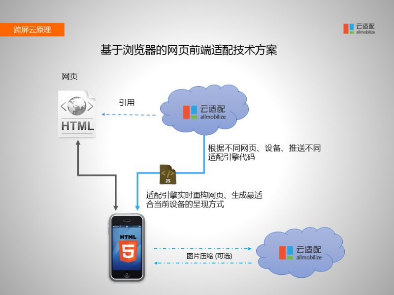 從跨屏云的工作原理可以看出,它是一個(gè)純前端的解決方案,不涉及后臺(tái)的東西,只要在網(wǎng)站前端加一串代碼,不需要原來PC網(wǎng)站的代碼和數(shù)據(jù)庫,這是非常安全的。用戶在用手機(jī)訪問原來網(wǎng)站的時(shí)候,因?yàn)榫W(wǎng)頁里加了云適配的代碼,手機(jī)瀏覽器就會(huì)加載這個(gè)代碼,從云端下載一個(gè)適配引擎,適配引擎會(huì)對(duì)當(dāng)前的網(wǎng)頁做出重新的排版,轉(zhuǎn)化成HTML5移動(dòng)應(yīng)用的效果。同時(shí)我們還提供圖片壓縮功能,可以大幅度增加下載速度。根據(jù)統(tǒng)計(jì)可以把圖片壓縮到原來的20%,也就是流量可以節(jié)省到原來的1/5,這也是非常有效果的。