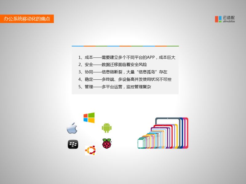 今天辦公系統(tǒng)移動(dòng)化的幾個(gè)痛點(diǎn):一是成本。需要為不同的平臺(tái)開發(fā)不同的APP成本非常大。二是很多政府、企業(yè)都會(huì)找第三方公司開發(fā)APP,這就需要政府開放數(shù)據(jù)庫接口、PC網(wǎng)站系統(tǒng)給他,這里會(huì)面臨數(shù)據(jù)泄露的問題,以及在開發(fā)、遷移過程中可能會(huì)導(dǎo)致現(xiàn)有的PC系統(tǒng)無法工作。三是開發(fā)的APP之間都是孤島,無法相互連接;四是穩(wěn)定性。不同員工手機(jī)上APP版本不同,在訪問現(xiàn)有系統(tǒng)的同時(shí)要考慮到不同的版本切換問題,對(duì)開發(fā)造成困難。同時(shí)要管理不同的平臺(tái),管理系統(tǒng)也是非常復(fù)雜的。