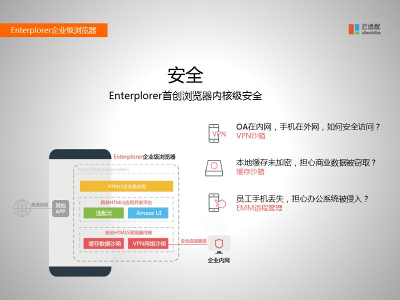 最重要的還是安全,目前市面上的瀏覽器都是給消費(fèi)者用的,在安全上并沒有下很深的功夫。很多企業(yè)的OA系統(tǒng)都是在內(nèi)網(wǎng)中的,外網(wǎng)是無法訪問的。這個(gè)在PC時(shí)代是沒有問題的,但是在移動(dòng)時(shí)代,領(lǐng)導(dǎo)經(jīng)常要出差,需要訪問內(nèi)網(wǎng)辦公系統(tǒng)。如何能夠安全的訪問到內(nèi)網(wǎng)系統(tǒng)面臨很大的挑戰(zhàn)。我們的瀏覽器內(nèi)核自帶VPN,通過瀏覽器直接撥到內(nèi)網(wǎng),OA還是在內(nèi)網(wǎng)上,很安全的。