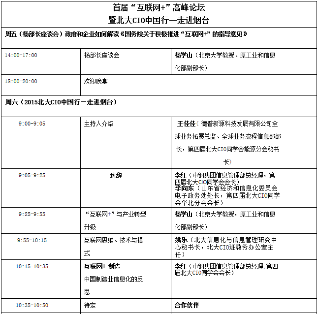 為了采擷有識之士的真知灼見,探究中國全面擁抱互聯(lián)網(wǎng)后經(jīng)濟社會發(fā)展的美好前景。2015年8月28-29日,“首屆“互聯(lián)網(wǎng)+”高峰論壇暨北大CIO中國行--走進煙臺”活動將落地山東煙臺,走進煙臺開發(fā)區(qū),CIO們再次聚首,討論“互聯(lián)網(wǎng)+”時代傳統(tǒng)企業(yè)的轉(zhuǎn)型與創(chuàng)新之道!值得一提的是,北京大學(xué)教授、原工業(yè)和信息化部副部長楊學(xué)山先生也將來到活動現(xiàn)場,與當(dāng)?shù)仄髽I(yè)的CIO們共同解讀《國務(wù)院關(guān)于積極推進“互聯(lián)網(wǎng)+” 的指導(dǎo)意見》,在美麗的煙臺,他們將碰撞出怎樣的火花?讓我們拭目以待吧!