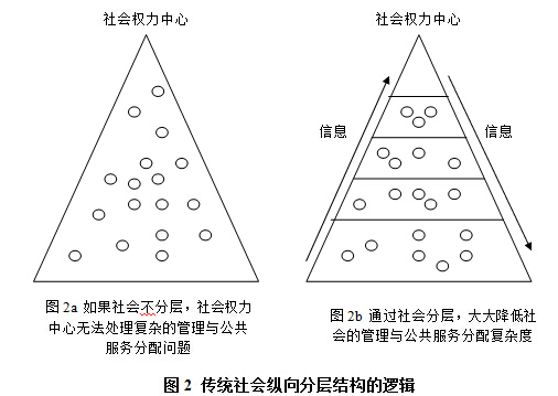 而從縱向來看,傳統(tǒng)社會形成的縱向科層結(jié)構(gòu),也是受制于信息交換不暢形成的降低管理復(fù)雜度的自然演化結(jié)果。對于任何一個形態(tài)較為復(fù)雜的社會而言,其需要解決兩個方面的問題,一是社會的有效組織,即通過有效的組織形式,來調(diào)配社會的組織資源,從而完成社會生產(chǎn)-分配-消費(fèi)等活動;二是有效的解決個體的公共服務(wù)需求問題,通過某種特殊的資源分配形式,從而形成有效的公共服務(wù)需求個體滿足,從而促使社會自身的發(fā)展并獲得社會個體對這一社會結(jié)構(gòu)基本的支持。而在傳統(tǒng)社會中,由于社會信息交換渠道有限,且信息處理能力狹窄,因此,社會中不可能每個個體都與社會中心形成信息交換,直接接受社會中心的指令,社會中心也無法直接了解到每個個體的需求,從而分配公共產(chǎn)品。因此,為了解決這一矛盾,最有效的方式是根據(jù)某種社會規(guī)則,形成特定的社會等級,而在每一等級內(nèi),其大體上社會個體的需求與能力是相同的,因此在管理上,只需要針對這一等級發(fā)號管理命令上即可,同樣,每一等級內(nèi)的公共服務(wù)需求也大體一樣,只需要按照等級供給就可以了。因此,通過等級化的方式,最終將原本千千萬萬不同的個體管理和公共服務(wù)供給,降低為十幾或者幾十種不同等級的管理與公共服務(wù)供給問題。而這樣就極大減少了管理和公共服務(wù)供給方面的復(fù)雜度,而從信息傳遞與處理而言,社會權(quán)力中心不再需要面對每個個體,只需要處理層級之間傳遞的信息即可,這就解決了傳統(tǒng)社會下,信息傳遞渠道有限與處理能力較低的問題(參見圖2)。