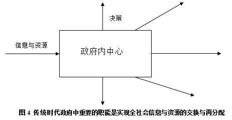 當(dāng)政府作為傳統(tǒng)社會的中心時,而在傳統(tǒng)政府內(nèi)部,也形成了中心型結(jié)構(gòu),也就是說傳統(tǒng)政府一定存在一個穩(wěn)固的最高權(quán)力中心,這一中心權(quán)力體決定著整個政府體系的運(yùn)行,一方面收集信息和資源,另一方面,發(fā)布命令,分配資源,驅(qū)使整個行政體系履行自身職能和作用(圖4)。因此,傳統(tǒng)政府在橫向也表現(xiàn)為典型的中心型結(jié)構(gòu)。[page]