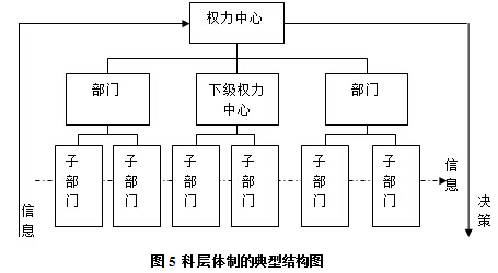圖5描述了這種結(jié)構(gòu),如圖中,在最高層,存在一個穩(wěn)固的權(quán)力中心,而在權(quán)力中心下,形成兩種下屬層級:一種直接服務(wù)于最高權(quán)力中心的職能部門;另一種是形成下屬的權(quán)力中心統(tǒng)管一方面的工作;而在每個下屬層級內(nèi),又根據(jù)需要形成級別更低的科層體系。