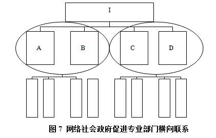 如圖7所示,A、B、C、D是四個下級管理部門,其分別下屬共八個業(yè)務(wù)部門,每個部門原轄兩個,但是由于網(wǎng)絡(luò)信息技術(shù)引發(fā)的管理幅度的增長,使得一個部門能夠承擔(dān)4個相關(guān)業(yè)務(wù)部門的管理,因此A與B,C與D,就能夠合并為新的部門。這樣對于更高一級的決策中樞I而言,相應(yīng)的直接面對的部門數(shù)量就會大幅度減少。這也就是網(wǎng)絡(luò)社會由于解決了信息充分交換與處理情況下,引發(fā)的大部門制的變革。[page]