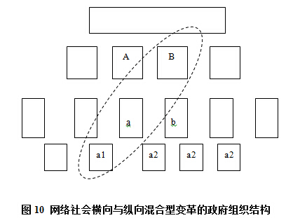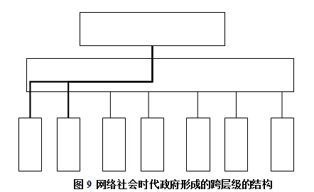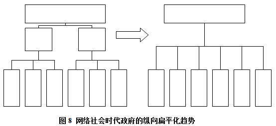 網(wǎng)絡(luò)社會的政府由于在縱向?qū)е铝斯芾矸鹊脑黾?,從而必然直接的?dǎo)致在同樣組織單元中,所需的層級也就相應(yīng)的變少了(因為很顯然,總的機(jī)構(gòu)數(shù)量一定情況下,管理幅度與管理層級呈反比)。那么,一個自然的結(jié)果是整個組織結(jié)構(gòu)會變得比原先要扁平。原先需要三級管理體系的可能兩級就可以。這種變化稱之為扁平化的變化。網(wǎng)絡(luò)社會的政府一定是比傳統(tǒng)政府更加扁平化(圖8)。