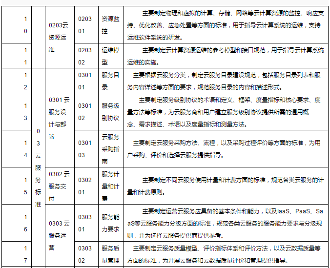 2.云資源標(biāo)準(zhǔn)。用于規(guī)范和引導(dǎo)建設(shè)云計(jì)算系統(tǒng)的關(guān)鍵軟硬件產(chǎn)品研發(fā),以及計(jì)算、存儲等云計(jì)算資源的管理和使用,實(shí)現(xiàn)云計(jì)算的快速彈性和可擴(kuò)展性。主要包括關(guān)鍵技術(shù)、資源管理和資源運(yùn)維等方面的標(biāo)準(zhǔn)。
