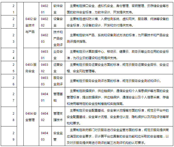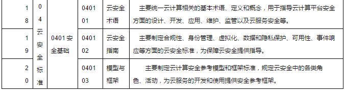4.云安全標(biāo)準(zhǔn)。用于指導(dǎo)實(shí)現(xiàn)云計(jì)算環(huán)境下的網(wǎng)絡(luò)安全、系統(tǒng)安全、服務(wù)安全和信息安全,主要包括云計(jì)算環(huán)境下的安全管理、服務(wù)安全、安全技術(shù)和產(chǎn)品、安全基礎(chǔ)等方面的標(biāo)準(zhǔn)。