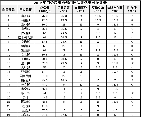 如下是2015年國務(wù)院組成部門政府網(wǎng)站績效評估得分排名: