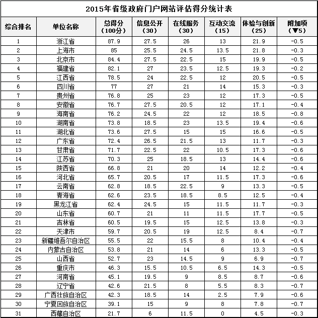 如下是2015年省級政府門戶網(wǎng)站績效評估得分排名: