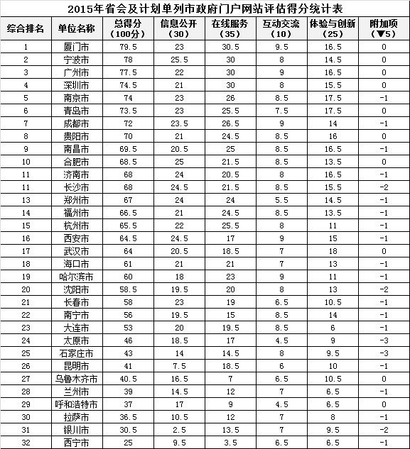 如下是2015年省會(huì)及計(jì)劃單列市政府網(wǎng)站績效評(píng)估得分排名: