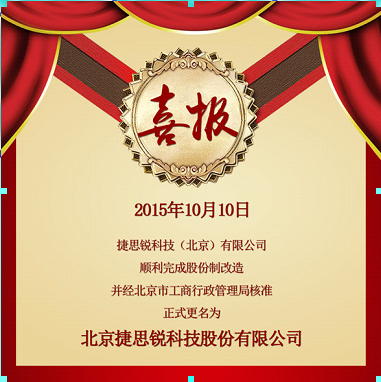 2015年10月10日,捷思銳科技(北京)有限公司順利完成股份制改造,并經(jīng)北京市工商行政管理局核準(zhǔn),正式更名為“北京捷思銳科技股份有限公司”。