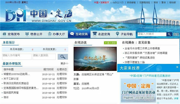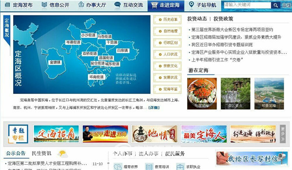 今天(11月11日),“中國·定海”政府門戶網(wǎng)站經(jīng)過改版全新上線,新版涵蓋定海發(fā)布、信息公開、辦事大廳、互動交流、走進(jìn)定海、子站導(dǎo)航6大版塊,融入更多新技術(shù)與新元素,增強(qiáng)政府門戶網(wǎng)站的全面性、實(shí)用性、服務(wù)性和規(guī)范性。