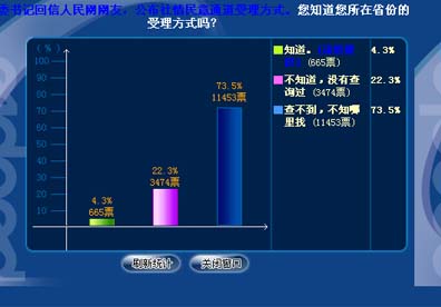人民網10月23日訊 為了解廣大網民對自己所在省份社情民意通道的知曉程度,10月21日,本網特別推出人民調查——您知道您所在省份社情民意的受理方式嗎?調查包括三個選項:一是知道;二是不知道,沒有查詢過;三是查不到,不知哪里找。截止23日下午14:30,共有15592人參與投票。其中,11453人選擇“查不到,不知哪里找”,占總投票人數(shù)的73.5%;選擇“不知道,沒有查詢過”的有3474人,占投票人數(shù)的22.3%;選擇“知道”的只有665人,占總人數(shù)的4.3%。據統(tǒng)計,超過95%的網民不知道、查不到所在省份社情民意受理聯(lián)系方式。