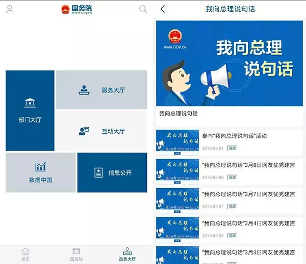 2016年2月,定位于發(fā)布政務信息和提供在線服務的新媒體平臺國務院客戶端開通上線,中央人民政府走近了公民的"身邊",界面清新、訪問流暢、交互性強,億萬公民可以通過這個APP第一時間掌上獲取各種政務信息、國務院動態(tài)、領導人觀點……客戶端的開通創(chuàng)新了政務信息公開方式、擴大了政務公開參與渠道。其中"我向總理說句話"圍繞民生領域羅列了簡政放權(quán)、宏觀調(diào)控、互聯(lián)網(wǎng)+、教育公平等多個分類,網(wǎng)民可以選取關(guān)心的話題向總理建言獻策,客戶端也對每日優(yōu)秀建言進行了及時整理與公開,"與總理對話"現(xiàn)已成為億萬網(wǎng)民最火熱的政民互動方式。