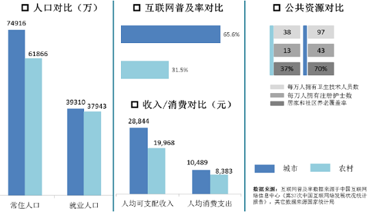 鄉(xiāng)村人口在消費水平,教育、醫(yī)療等公共服務(wù)以及網(wǎng)絡(luò)基礎(chǔ)設(shè)施方面與城鎮(zhèn)居民都存在較大差距。2014年,鄉(xiāng)村人口規(guī)模降至6.2億,接近城鎮(zhèn)人口規(guī)模,但人均可支配收入?yún)s不足城鎮(zhèn)居民的4成。農(nóng)村居民消費水平為0.87萬,僅占城鎮(zhèn)居民的34.4%;農(nóng)村每萬人擁有的衛(wèi)生技術(shù)人員、注冊護士和醫(yī)療機構(gòu)床位數(shù)與城鎮(zhèn)居民的比例均在30.0%-45.0%區(qū)間;城鎮(zhèn)與農(nóng)村地區(qū)的互聯(lián)網(wǎng)普及率分別為64.2%、30.1%,相差34.1個百分點。