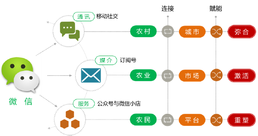 微信通過農(nóng)村與城市、農(nóng)業(yè)與市場、農(nóng)民與平臺的連接,為“三農(nóng)”發(fā)展賦能,發(fā)揮彌合城鄉(xiāng)差距、激活農(nóng)業(yè)、重塑農(nóng)民的價值。