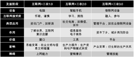 近年來,隨著我國農(nóng)村制度改革的不斷推進和農(nóng)業(yè)經(jīng)濟的快速發(fā)展,“三農(nóng)”領(lǐng)域的整體發(fā)展水平在一定程度上得以提升?!盎ヂ?lián)網(wǎng)+”作為新常態(tài)下推動生產(chǎn)方式轉(zhuǎn)變和生產(chǎn)效率提升的強力引擎,正逐步滲透到行業(yè)發(fā)展以及社會運轉(zhuǎn)的每一個環(huán)節(jié)中,在彌合城鄉(xiāng)差距、倒逼“三農(nóng)”改革方面初見成效。但同時我們也應(yīng)清醒地認識到,城鄉(xiāng)數(shù)字鴻溝、農(nóng)村信息孤島等現(xiàn)象依然存在,諸多“互聯(lián)網(wǎng)+”三農(nóng)應(yīng)用與模式尚在探索,在用戶習慣、思維、能力方面的培養(yǎng)尚需繼續(xù)加強。通過研究,“互聯(lián)網(wǎng)+”三農(nóng)可分為三個階段,并在上網(wǎng)設(shè)備、互聯(lián)網(wǎng)接受程度、典型應(yīng)用、作用、價值、影響、障礙等方面呈現(xiàn)不同特征。