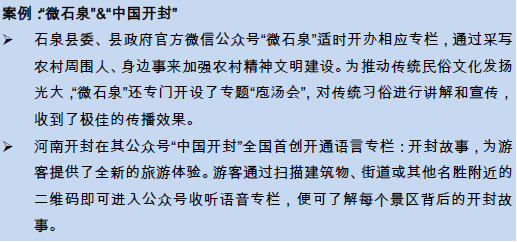政民交流互動,收集民意:微信公眾平臺提高了農(nóng)村事務(wù)的知曉率,也提高了村民的參與度,有利于民情收集。例如,鴻山鎮(zhèn)伍堡村委會每月都會在微信上收到村民對村務(wù)工作的意見和建議,并將匯總的意見和反饋情況在微信上公開,極大提高了村民的滿意度;圍頭村根據(jù)公眾號收集到的來自游客的反饋和建議,創(chuàng)新了首個民宿試點、戰(zhàn)地食堂等多個旅游產(chǎn)品,有力地提高了景區(qū)的吸引力。據(jù)統(tǒng)計,當年來圍頭灣的游客總量達到75萬人次。