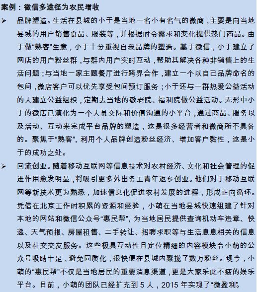 移動互聯(lián)時代,數(shù)字成本降低惠及了更多不發(fā)達地區(qū),擴大了數(shù)字技術(shù)的擴散半徑。截至2015年12月,農(nóng)村網(wǎng)民規(guī)模達1.95億,占農(nóng)村總?cè)丝诘?1.5%。其中,即時通信工具的使用率第一,比例為87.2%1。微信作為用戶數(shù)最多的社交平臺,在三農(nóng)中的應(yīng)用日益深入,從工具到平臺,從信息到服務(wù)。