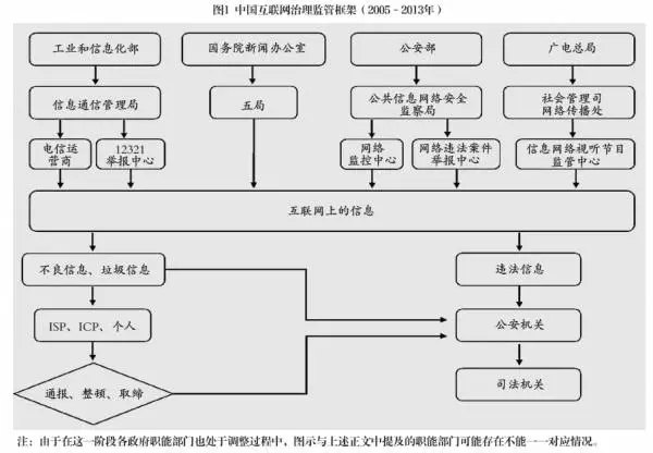 第三,對(duì)我國互聯(lián)網(wǎng)信息內(nèi)容管理的主管機(jī)構(gòu)、制度建設(shè)進(jìn)程特點(diǎn)進(jìn)行了研究。張文祥認(rèn)為,從1994年接入互聯(lián)網(wǎng)以來,新聞信息就是我國互聯(lián)網(wǎng)信息管理的重要對(duì)象,經(jīng)過20年的探索,目前已形成一套復(fù)雜的互聯(lián)網(wǎng)新聞信息管理制度,帶有較為濃重的“規(guī)制摸索”特征。曠野認(rèn)為,自上個(gè)世紀(jì)90年代起,我國的信息化制度建設(shè)進(jìn)程明顯加快,一個(gè)與信息化發(fā)展相適應(yīng)的法制環(huán)境正在形成。主要表現(xiàn)在:(1)數(shù)據(jù)電文的法律制度已經(jīng)形成;(2)互聯(lián)網(wǎng)信息分類管理的法律框架已具雛形;(3)電信法、廣播網(wǎng)分業(yè)監(jiān)管的格局基本維持;(4)信息技術(shù)應(yīng)用的相關(guān)法律制度仍在探索完善中;(5)信息安全的法律制度已有一定基礎(chǔ)。高宏存、于正認(rèn)為,網(wǎng)絡(luò)新媒體的監(jiān)管反映出政府治理水平提升的過程,并總結(jié)了四類參與網(wǎng)絡(luò)新媒體管制的行政機(jī)構(gòu):(1)接入監(jiān)管部門,如工信部門與工商部門;(2)安全管理部門,如公安部門和國家安全部門;(3)中央和地方的新聞辦公室和對(duì)外宣傳辦公室是我國網(wǎng)絡(luò)新媒體最直接的內(nèi)容管制部門;(4)其他有關(guān)部門,主要指文化部門、新聞出版部門、廣電部門。他們將新媒體的監(jiān)管劃分為四個(gè)階段:奠基起步階段、激勵(lì)發(fā)展階段、問題治理階段、綜合治理階段。分別涉及的核心議題包括基礎(chǔ)設(shè)施保護(hù)、信息服務(wù)管理、傳播權(quán)利保護(hù)、不良信息整治。