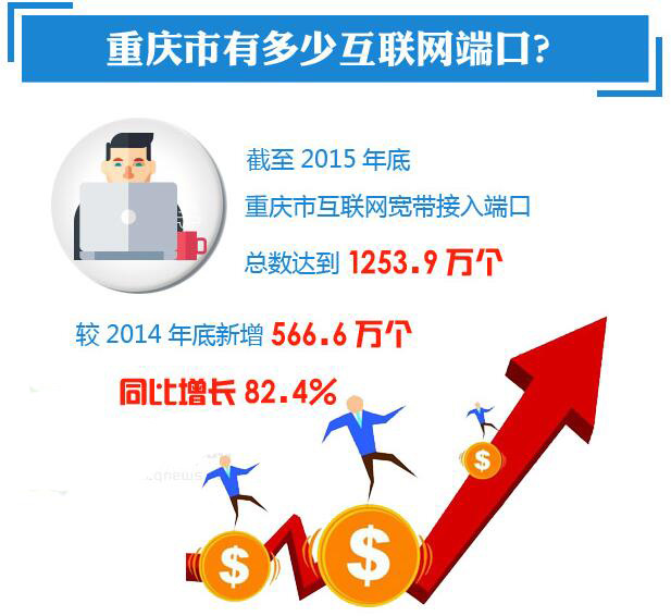 報告顯示,截至 2015 年底,重慶市光纜線路總長度達到 65.4萬公里,同比增長11.8%;互聯(lián)網(wǎng)寬帶接入端口總數(shù)達到 1253.9 萬個,較2014 年底新增 566.6 萬個,同比增長 82.4%。重慶市互聯(lián)網(wǎng)寬帶接入用戶中,速率在 8M 以上用戶占比 75.3%,較 2014 年提高 42.4 個百分點,居全國第 17位。其中,速率在 20M 以上的寬帶用戶達到 189.3 萬戶,占比達到 37.4%,居全國第 15 位。重慶市移動電話基站數(shù)達到 9.0 萬個,較 2014 年底新增 1.6 萬個,同比增長 21.6% ;WLAN 公共運營接入點(AP)數(shù)達到 13.0 萬個;3G 基站數(shù)達到2.8萬個,較2014年新增0.1萬個,同比增長3.7%;4G基站數(shù)達到3.0萬個??梢钥闯?,目前重慶市的網(wǎng)絡(luò)成長能力大幅提升,網(wǎng)絡(luò)基礎(chǔ)設(shè)施已具備為重慶市“互聯(lián)網(wǎng) +”發(fā)展提供堅實基礎(chǔ)的條件。2015年,重慶市網(wǎng)絡(luò)基礎(chǔ)設(shè)施建設(shè)日趨完善。