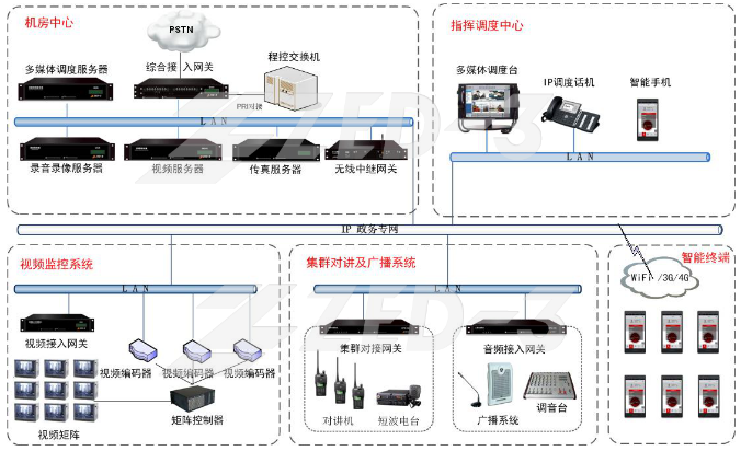 捷思銳政府應(yīng)急指揮平臺依托電子政務(wù)專網(wǎng),將各種通信終端接入綜合指揮調(diào)度系統(tǒng),進(jìn)行統(tǒng)一的呼叫調(diào)度和錄音,并提供與業(yè)務(wù)系統(tǒng)、地理信息系統(tǒng)、短信平臺的對接。綜合指揮調(diào)度系統(tǒng)融合了PSTN公共交換電話網(wǎng)、集群通信系統(tǒng)、公眾移動通信系統(tǒng)、多路傳真系統(tǒng)、視頻調(diào)度系統(tǒng)、音響廣播系統(tǒng)等。