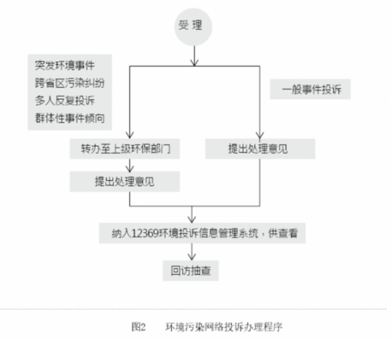 在組織機(jī)構(gòu)上,我國(guó)沿襲了韋伯官僚制組織機(jī)構(gòu),具有金字塔式的等級(jí)制、專(zhuān)業(yè)分工、明確程序與制度等特征,因此政府管理系統(tǒng)層級(jí)設(shè)置與部門(mén)增多,機(jī)構(gòu)臃腫,人浮于事。 借助互聯(lián)網(wǎng)平臺(tái)能夠整合資源,調(diào)整政府機(jī)構(gòu)或職能,集中處理投訴案件。2010年7月,鄭州市人民政府成立網(wǎng)絡(luò)信息發(fā)布中心(ZZIC),以“事事有回應(yīng),件件有回音”為口號(hào),承擔(dān)政務(wù)信息發(fā)布、轉(zhuǎn)辦網(wǎng)友意見(jiàn)和投訴等職責(zé)。環(huán)境保護(hù)部設(shè)立“12369”環(huán)保舉報(bào)熱線,明確辦理投訴件的程序(見(jiàn)圖2),建立投訴信息管理系統(tǒng),每個(gè)投訴件設(shè)立一個(gè)編號(hào),供舉報(bào)者查詢(xún)辦理進(jìn)程。并進(jìn)行監(jiān)督和回訪抽查,如果投訴人對(duì)處理結(jié)果不滿(mǎn)意,受理者須限期重新回復(fù)和調(diào)節(jié)糾紛。
